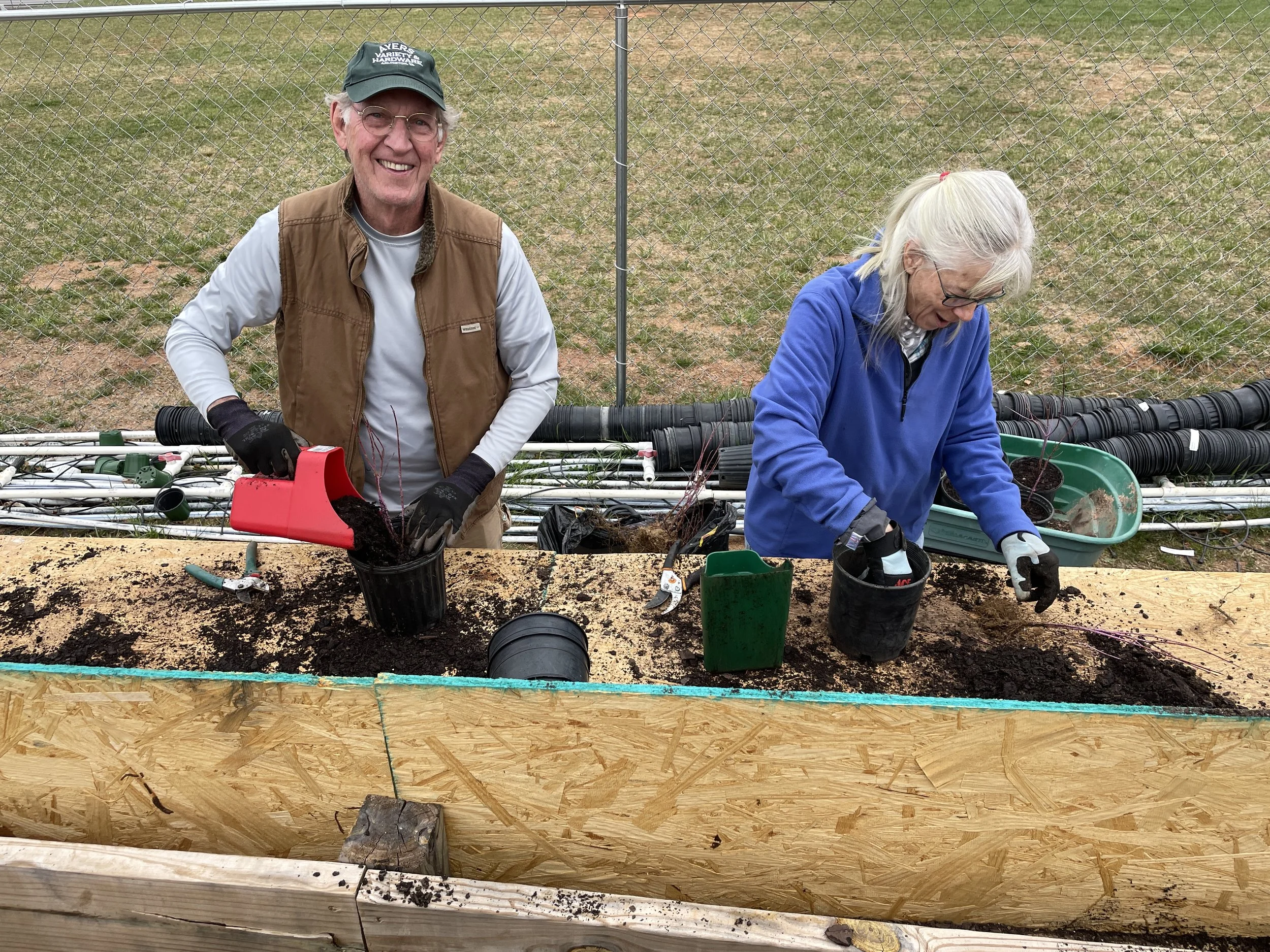Mary Pat and Tom plant seedlings during a nursery workday.
