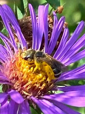 The other bee herd we saw on our safari was the ever-colorful sweat bees—the ones that sometimes land on our arms to gather our salty sweat. With legs covered in yellow pollen from a New England Aster (Aster novae-angliae) and sporting that tell-tale black and white striped abdomen, this Furrow sweat bee (in the Halictus genus) seemed to be so cool, she had to wear shades. Try as we might, we were unable to really determine this gorgeous Furrow bee’s species.