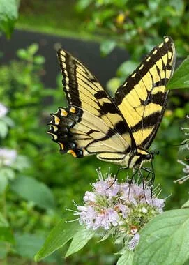 Within minutes, my companions, Florrie Funk and Martha Baskin, were snapping their cameras. There it was, a Tiger Swallowtail nectaring, with proboscis fully extended, on a Hoary Mountain Mint (Pycnanthemum incanum) flower. Was it an Eastern (Papilio glaucus) or an Appalachian (Papilio appalachiensis)? The Eastern Tiger tends to be a slightly smaller, and has thicker vertical black stripes, more blue on its hindwing (lower wing), and a spotted yellow band on its forewing’s (upper wing’s) underside, compared with a solid broad band on the Appalachian Tiger. So ours must be an Eastern. Was it male or female? It’s harder to tell on the ventral (under) side of the wings, but the bluish area on the ventral hindwing has one row of orange spots—she must be a lady!