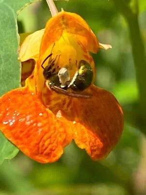 Green Metallic Sweat Bees were slurping nectar from the orange Jewelweed (Impatiens capensis) all along the greenway. Although hummingbirds frequent Jewelweed too, we weren’t lucky enough to see them on this safari. Jewelweed is especially at home near rivers and streams since it can tolerate flooding. When its seed pods ripen, they explode, giving the plant its nickname, Touch-Me-Not.