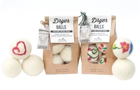 Wool dryer balls are a simple swap for dryer sheets. Made of natural material, they will biodegrade after use, do not contain toxic chemicals, and can be re-used for up to 1000 loads. Wool dryer balls replace dryer sheets in function by softening clothes and reducing static cling. They speed up the drying process, which saves money, time, and energy. Because they are made of natural materials, they can be returned to the earth at the end of their life and do not need to be sent to the landfill. If you also want to recreate the fresh scent of traditional dryer sheets, apply a few drops of your favorite essential oils to the dryer balls before placing them in the load. Locally, Shecology sells dryer balls at Littlest Birds, or they can be ordered online.